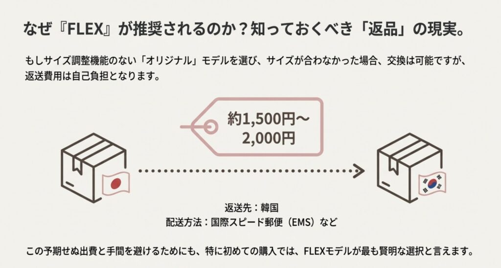 ここが一番の注意点です!通販で購入してサイズが合わなかった場合、返品や交換は可能ですが、韓国への返送送料は基本的に「自己負担」となります。