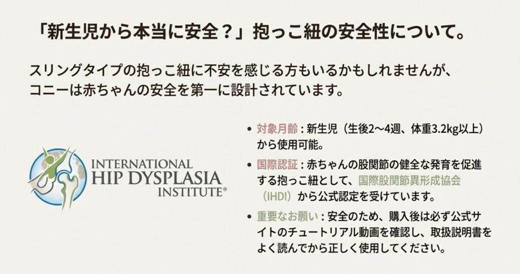 コニーの抱っこ紐は、新生児(生後2週間、体重3.2kg以上)から使用できるように設計されています。