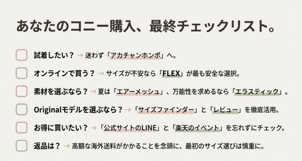 最後に、これまでのポイントをまとめます。コニー抱っこ紐の取り扱い店舗を探しているあなたが、最適な方法で手に入れられるよう整理しましょう。