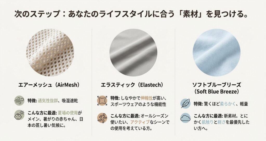 - 夏用なら「エアーメッシュ」、肌触り重視なら「エラステック」を選ぶ。