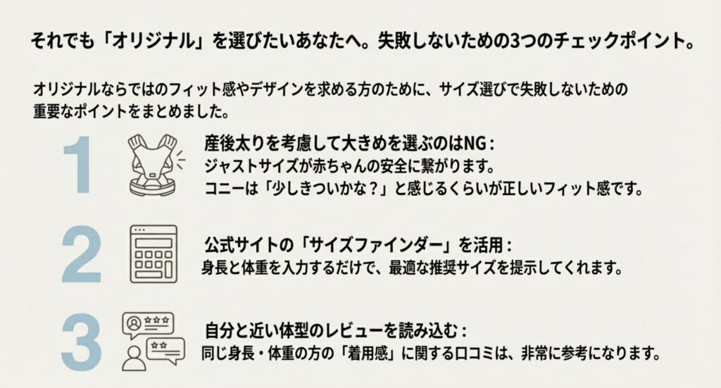 だからこそ、私は最初の章でお伝えしたように「アカチャンホンポで試着する」か、「サイズ調整可能なフレックスを選ぶ」ことを強くおすすめしています。このリスクを知っているだけで、買い物の失敗はグッと減らせますよ。