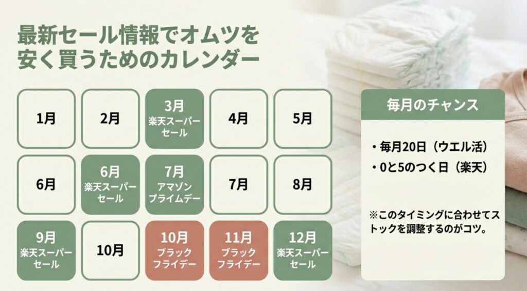 「いつ買うのが一番お得なの?」という疑問にお答えして、1年間の大まかなセールカレンダーを作成しました。このタイミングに合わせてストックを調整するのが、賢い箱買いのコツですよ。