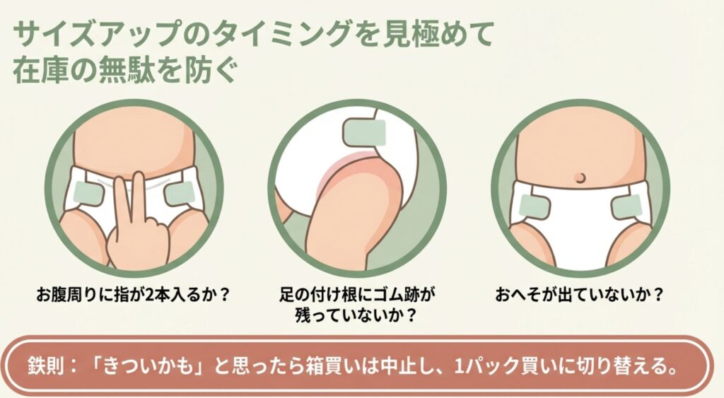 チェックポイントは、「お腹周りに指が2本すんなり入るか」「足の付け根にゴムの跡が強く残っていないか」「おへそがオムツから出ていないか」の3点です。これらに引っかかるようになったら、次のサイズへの移行を検討しましょう。箱買いをするなら、新しいサイズに切り替えた直後が一番安全です。逆に、今のサイズが少しでも「きついかな?」と感じたら、箱買いはグッと堪えて、割高でも1パックずつ購入するのが結果的な節約に繋がりますよ。サイズ選びに迷った時は、おむつのサイズ選びガイドを参考にしてみてくださいね。