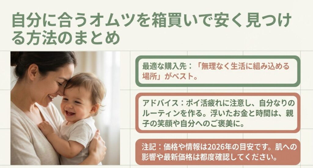 この記事で紹介した価格やセール情報は、2026年現在の一般的な目安です。実際の価格は、各サイトや店頭で直接確認してくださいね。また、オムツのサイズ選びや肌トラブルについては、自己責任での判断となります。もし気になる症状がある場合は、迷わず小児科や皮膚科の先生に相談してください。あなたと赤ちゃんの毎日が、より笑顔でいっぱいになることを願っています!