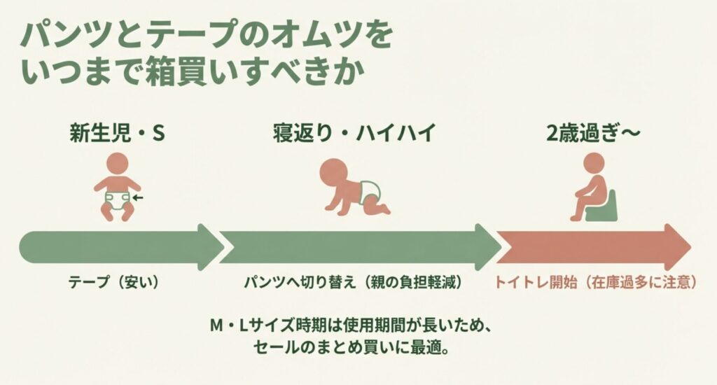 箱買いをいつまで続けるかについては、トイトレ(トイレトレーニング)の時期も関係してきます。2歳を過ぎてトイトレが始まると、急にオムツを使わなくなる日が出てきます。この時期に大量のストックを抱えるのは危険です。逆に、MサイズやLサイズの期間は比較的長いので、この時期こそがセール時のまとめ買いのチャンスですよ。特にLサイズは3歳を過ぎても夜間だけ使うケースも多いので、余裕を持ってストックしても無駄になりにくいです。パンパースとメリーズ、どちらがいいか迷っている方は、パンパースとメリーズの徹底比較記事をチェックしてみるのもいいかもしれません。