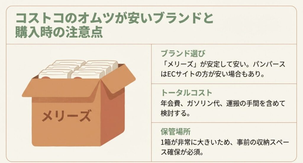 一方で、パンパースについてはAmazonや楽天のセールの方が安くなるケースもあります。コストコを利用する際は、年会費(税込4,840円)やガソリン代、そして自宅までの運搬の手間も考慮しましょう。「ついでに美味しいお肉やデリカも買う!」というエンタメ性を含めて楽しめるなら最高ですが、オムツ代単体で元を取ろうとすると、相当な枚数を消費する必要があります。また、箱が非常に大きく、1箱に3〜4パック入っているため、部屋の収納スペースもしっかり空けておいてくださいね。