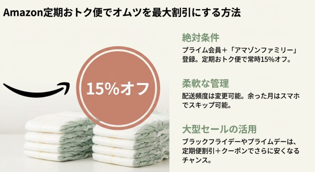 「定期便だと使い切れないかも……」という不安もありますよね。でも大丈夫。Amazonの定期便は、配送頻度を1ヶ月から半年まで自由に変えられますし、余っているときは1回分をスキップするのもスマホ一つで完結します。さらに強力なのが、大型セールの「ブラックフライデー」や「プライムデー」です。この時期は定期便の15%OFFに加えて、20%〜30%もの割引クーポンが重なることがあります。プレミアムラインのオムツをスタンダードライン以下の価格で手に入れられることもあるので、セールの時期は必ずチェックしておきましょう。