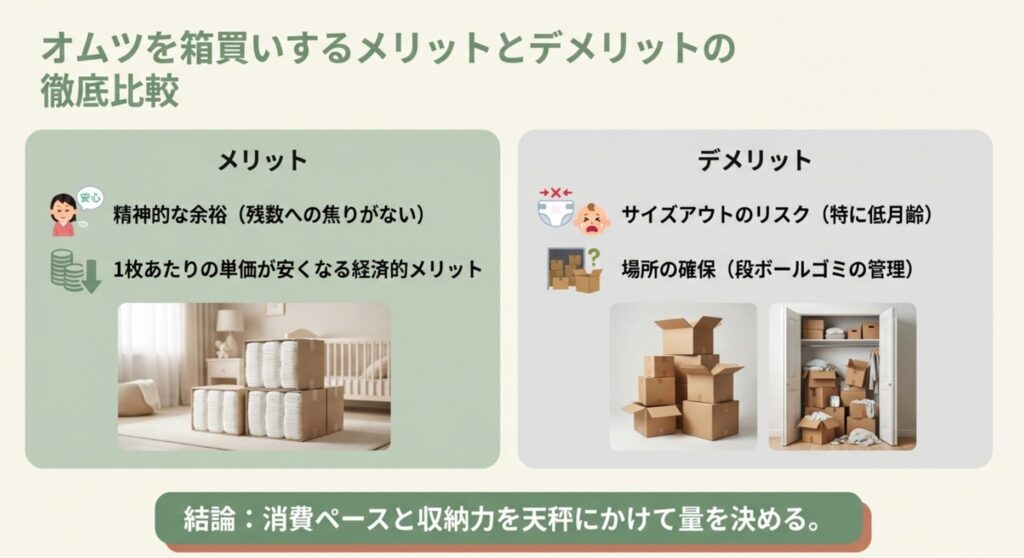 一方で、デメリットは「サイズアウトのリスク」と「場所の確保」です。特に新生児期からSサイズにかけては、子供の成長スピードが驚くほど早いです。「安かったから3箱買ったのに、1箱使い切る前にきつくなった……」という失敗談は、子育てあるあるの筆頭です。また、大量の段ボールゴミが出るので、ゴミ出しの日をチェックしておく必要もあります。メリットとデメリットを天秤にかけて、今の我が家に必要な量を慎重に見極めましょう。